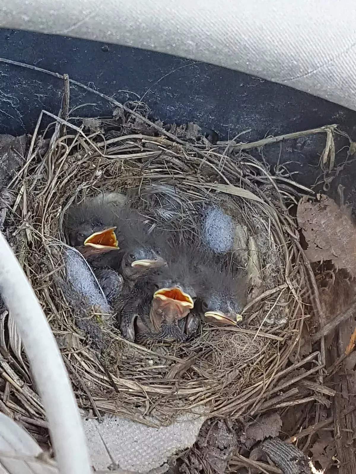 Ptica je izginila pod pokrov razdelilne omarice za hidravliko dvigala, ki je nameščena na podestu tovornjaka. Ko je odstranil pokrov, je videl, da je ptica tam imela že kake štiri tedne stare mladičke. Ker bi starejši mladiči lahko iz gnezda zleteli tudi drugje po Sloveniji, se je čez nekaj dni odločil, da gnezdo z mladički prestavi na varno mesto blizu mesta, kjer je samička čakala na prihod tovornjaka. Ker je bilo gnezdo na izredno izpostavljenem mestu – nad omarico, kjer je voznik vsakodnevno nalagal kontejner s plastiko – je bila odločitev še toliko bolj utemeljena.